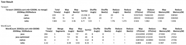 아래 표는 200GB 의 Test 데이터를 TeraSort 와 WordCount 를 수행했을 때의 결과 표 입니다.
