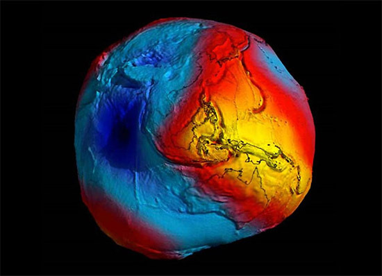 따라서 일정한 규칙에 따라 위치를 표현하기 위해서는 새로운 지구의 수학적 형상을 필요로 하는데, 측지학에서 정립한 각종 작업의 기준이 되는 이 새로운 지구의 수학적 모델을 지오이드(Geoid)라 합니다. 이는 중력방향에 직각인 등중력포텐셜면(작용하는 중력이 모든 곳에서 일정한 잠재력을 갖는 면) 중 평균해수면에 일치하는 것으로, 해양에서는 평균해수면과 일치하고 육상에서는 땅속을 통과하게 됩니다.