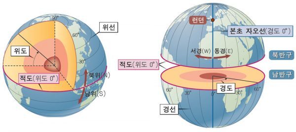 경도는 영국 옛 그리니치 천문대를 기준으로 동과 서를 세로로 표시하는 도표입니다. 그리니치 천문대에서 오른쪽으로 가면 동경이라고 하며, 왼쪽으로 가면 서경이라고 표시합니다. 동경과 서경이 만나는 180도 지점이 날짜가 변경되는 선입니다. 영어로는 동경은 E(East), 서경은 W(West)로 표시합니다.