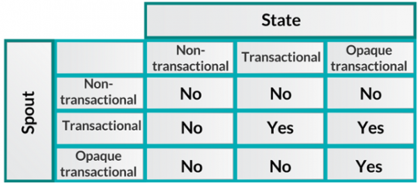 Trident 는 정확히 한번만 데이터를 전달하는 것을 보장하기 위해 아래 표와같은 추상화 개념을 정의하고 있으며, 관련하여 약간의 제약들이 있는데 자세히 파악하기 위해서는 많은 시간이 걸립니다(시간이 허락할 때 별도의 포스팅을 하겠습니다).