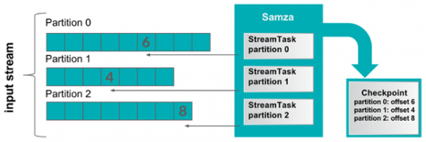 Kafka 는 아래 그림에서 처럼 input stream 의 partition 별로 offset을 저장하는데, Samza 는 이 offset 값을 모니터링 하다가 데이터 처리를 실패하게 되면 이 offset 값을 참조하여 실패한 데이터에 대한 재처리를 하게 됩니다. 문제는 offset 이 기록된 이후 새로운 offset 을 남기기 전까지 어떤 메세지까지 처리되었는지를 알 수 없게 되며, 장애 발생 시 offset 시점 이후 데이터를 재처리 하게되면 두번씩 처리되게 되는 경우가 발생할 수 있습니다(이러한 데이터 전달 방식을 At least once 라고 부릅니다).